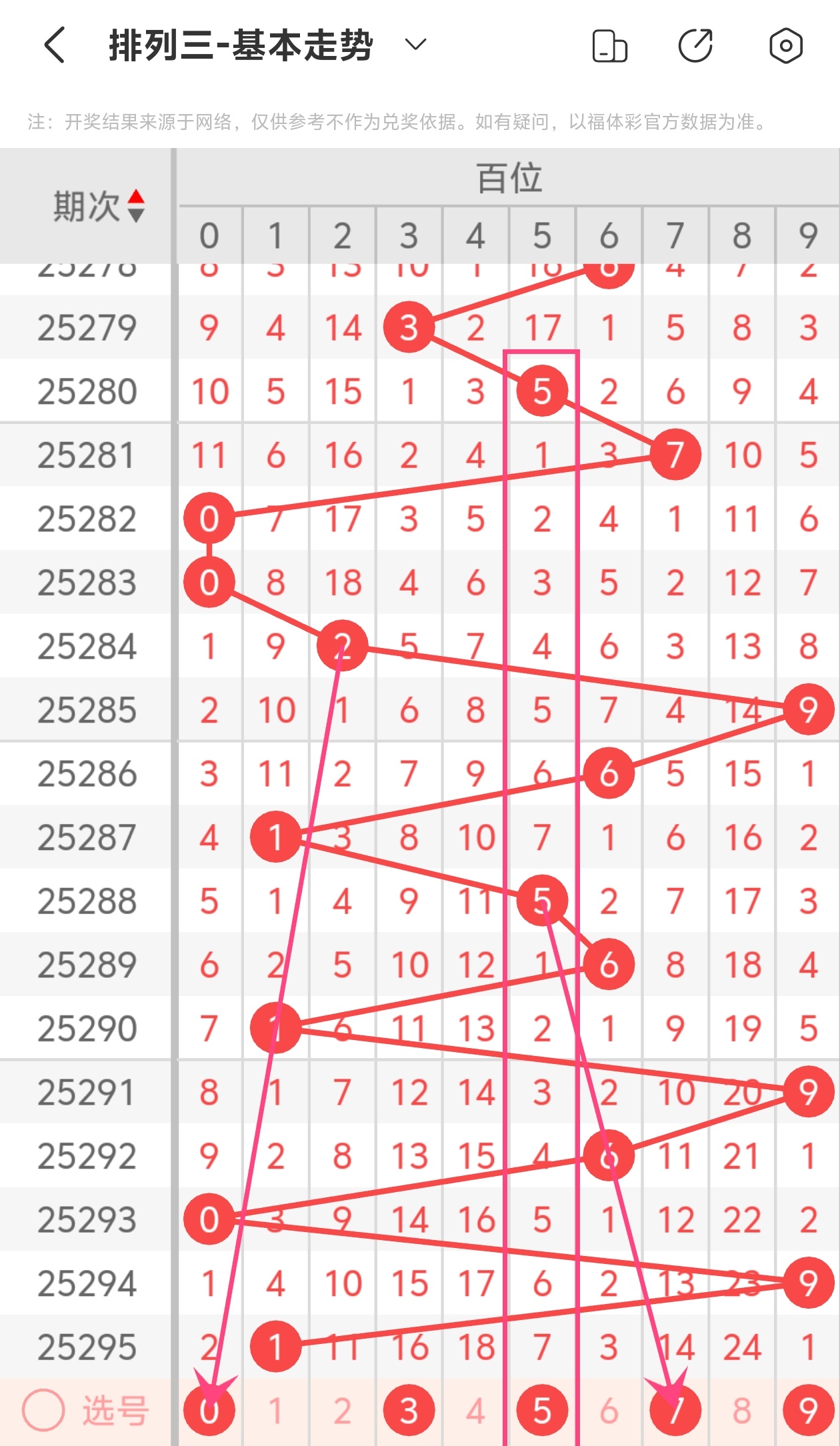 上期百位开出1,本区与上期的跨度为8,本期我们可以从上面走势图中看出选号的思路,0为斜连走势跨度为一,5为对称形态,7为斜连走势跨度为六,综合以上分析,本期百位推荐:03579