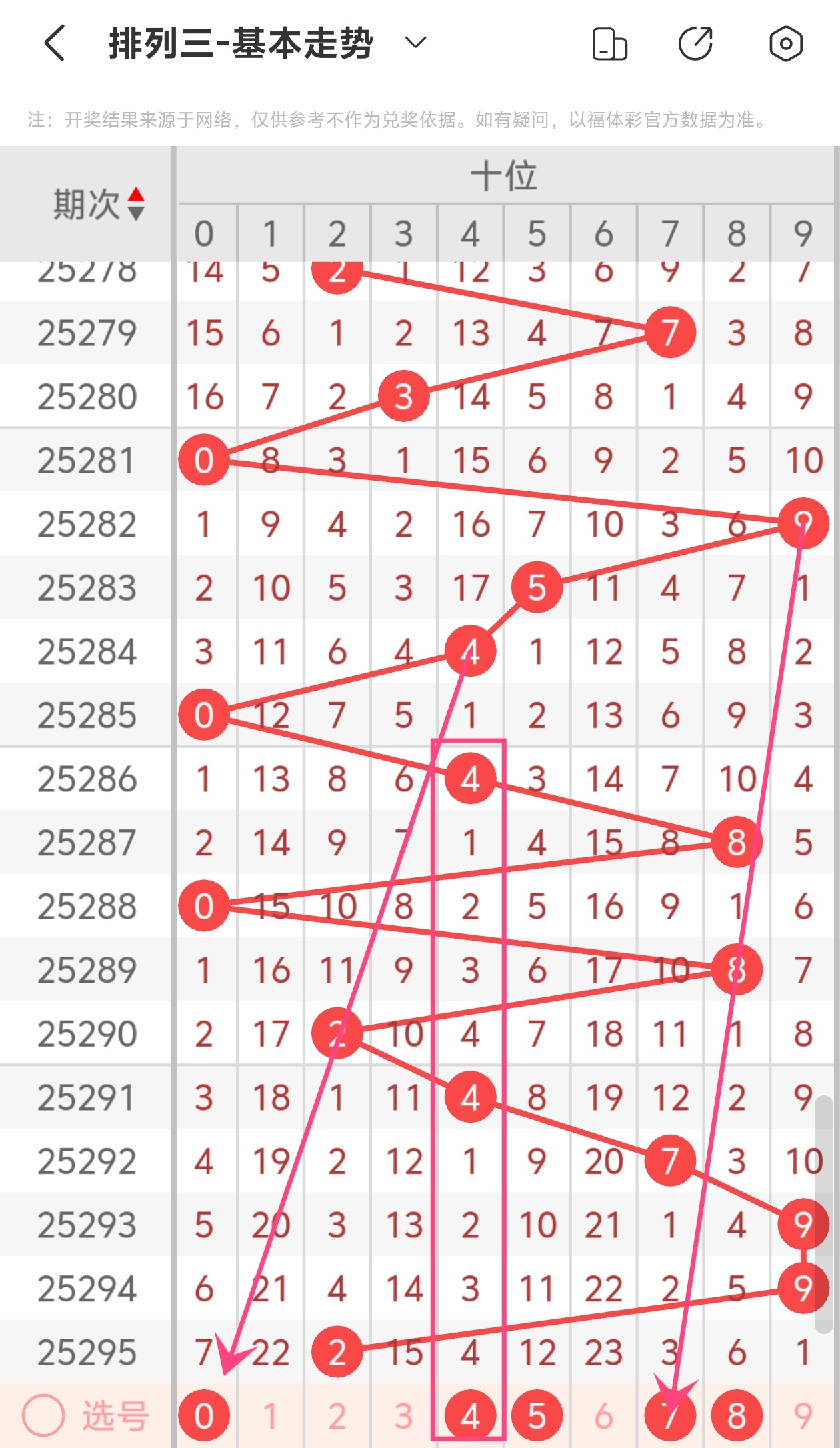 上期个位开出4,本区与上期的跨度为0,本期我们可以从上面走势图中看出选号的思路,2为斜连走势跨度为二,3为斜连走势跨度为一,5为对称形态走势,综合以上分析,本期个位推荐:23589