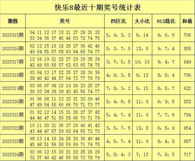 福彩快乐8第2023324期开奖回顾:02 06 12 15 20 21 22 25 26 29 32 37 40 42 46 55 58 72 78 79,其中奖号四区比为5:8:4:3。