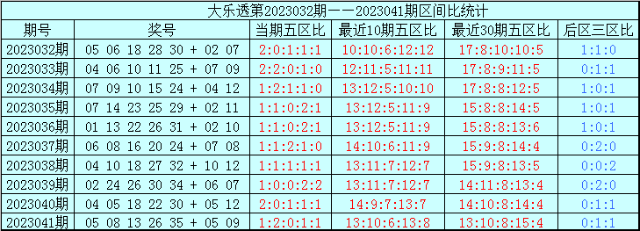 最近100期前区五区比为121:95:93:112:79,最近30期前区五区比为35:31:20:41:23,最近10期前区五区比为13:10:6:13:8,上期前区五区比为1:2:0:1:1。