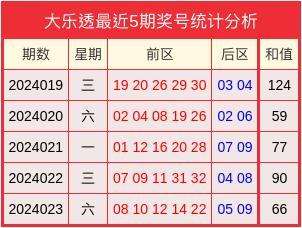 开奖回顾:大乐透2024023开奖号码为08、10、12、14、22+05、09。其中大小比为1:4,和值为66。