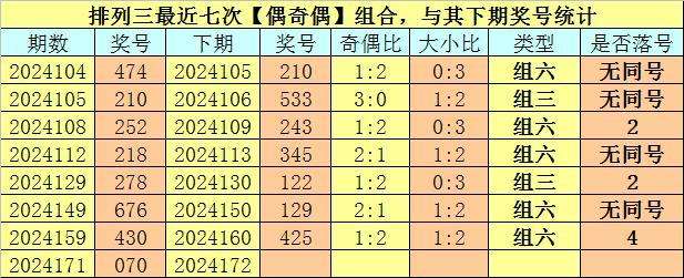 开奖回顾:排列三第2024171期开奖号码为:070。奖号类型为:组三,大小类型为:小大小,奇偶类型为:偶奇偶,包含重号:0。