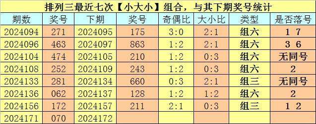 大小分析:排列三上期开出号码070,大小类型为【小大小】,最近七次开出大小类型小大小的奖号分别为:271、463、474、252、281、062、172,其下期分别开出号码:175、863、210、243、660、128、211。其中号码大小比为7:14,大号出现次数较少,本期防止大号反弹,开出全大组合。