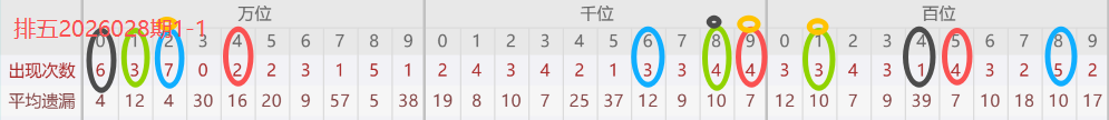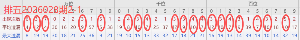 下图所圈出的为近30期各位置所出现的热码出现次数及平均遗漏值,用以参考和一些冷码组合选号。