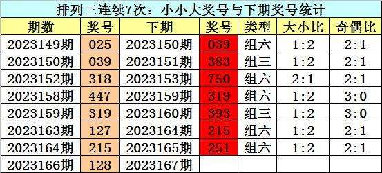 大小判断:上期排列三奖号为128,大小为:小小大,近7次大小为小小大的奖号为:025-039-318-447-319-127-215。