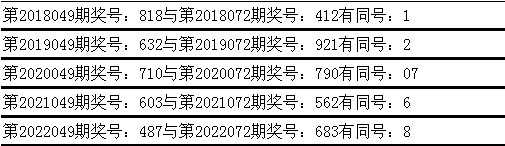 与前期历史同期奖号对比分析,在最近五年开奖中,第049期同期奖号与第072期同期奖号都出现了相同号码: