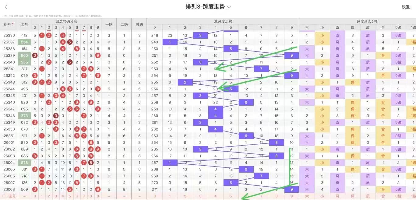 10期内跨度走势为:6-8-3-8-9-1-6-7-5-9,10期内大小跨比为8:2,奇偶跨比6:4,百期内跨度9共开出9次,下期数据:7 5 5 5 1 6 3 2 近期度较热,考虑跨度9开出后容易出大跨度,近期大小规律下大:奇:质,所以接下来继续大跨,奇跨度表现!