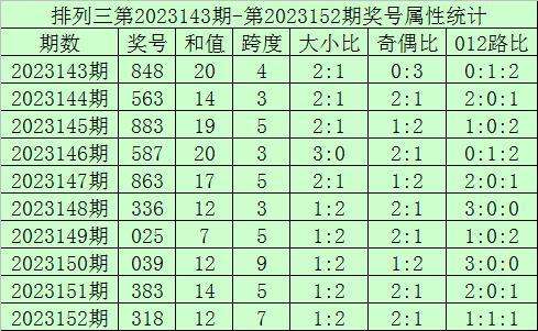 上期回顾:排列三第2023152期开奖号:318,奖号和值:12,奇偶比2:1,大小比1:2。