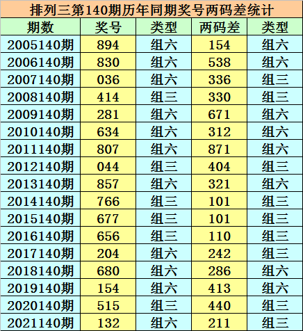 在历年开奖中,两码差开出年限分别为:1出现10年,0、3出现6年,2、4出现5年,6、8出现3年,5、7出现2年,9出现0年,第2022140期预计两码差出现:3、4、7。
