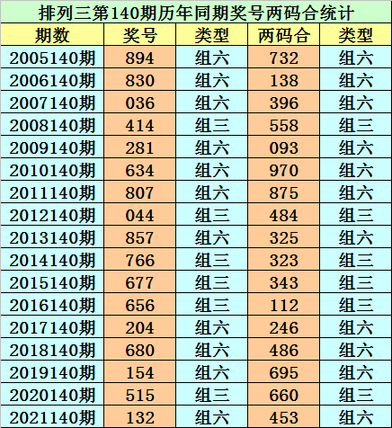 在历年同期中两码合开出年限分别为:3出现8年,2、4、5、6、8出现5年,9出现4年,0、7出现3年,1出现2年,第2022140期预计两码合出现:0、3、7。