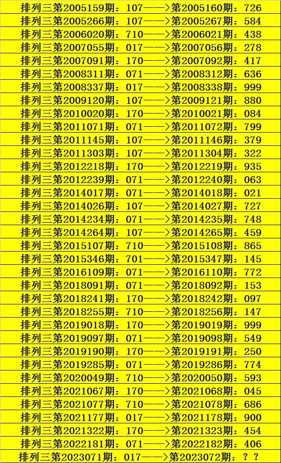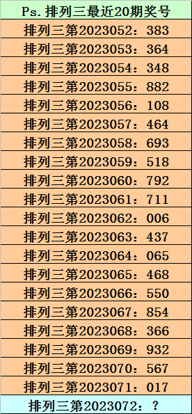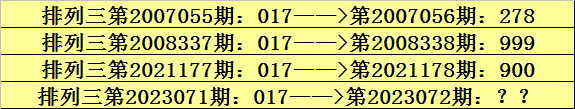 第2023071期排列三奖号为017,历史上该号码直选出现4次,下期奖号分别为:278、999、900。