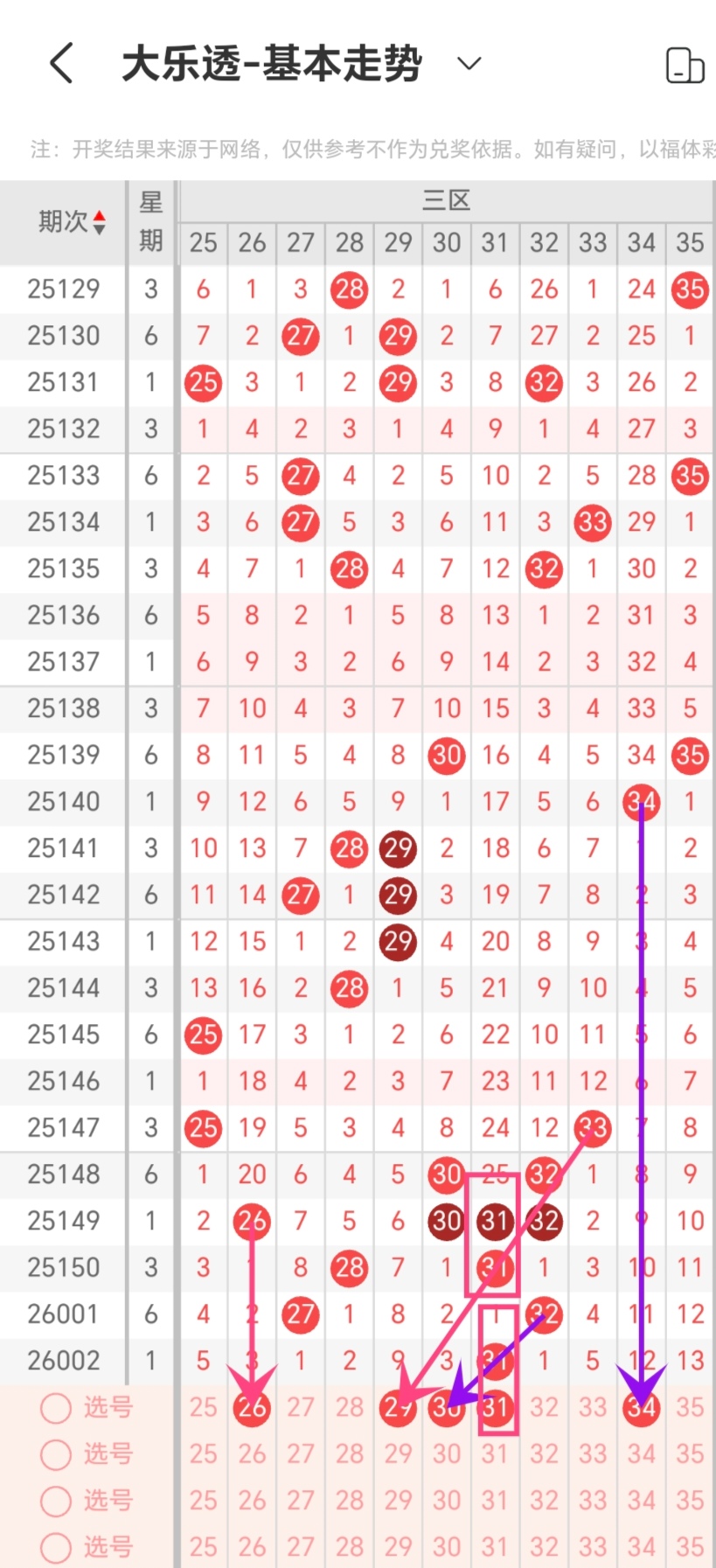 通过对同期次重号出现的数量规律进行统计分析,本期考虑出号1-2个,即10-25-30-32-34出号1-2个
