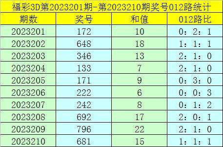 上期回顾:福彩3D第2023210期开出奖号:681。奖号为组六形态,与试机号没有同,奇偶比为1:2,大小比为2:1,012路比为1:1:1,和值为15,跨度为7。