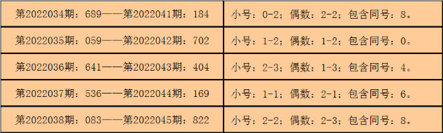 所以,3D第2022039期开出奖号:787,其大小比为3:0,奇偶比为2:1,012路比为0:2:1,与3D第2022046期奖号可能有同号。