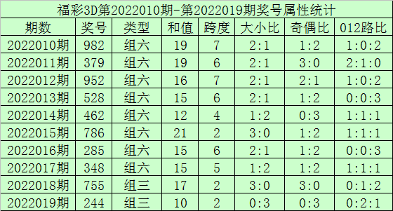 开奖回顾:福彩3D第2022019期开奖号:244,其中奖号和值:10,奇偶比0:3,大小比0:3。