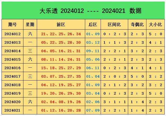 上期回顾:大乐透第2024021期奖号为:前区01、12、16、20、28,后区07、09,前区奖号三区比为2:2:1,奇偶比为1:4,大小比为2:3,后区开出大大组合07、09