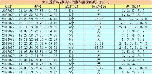 大乐透历年同期第072期后区尾数奇偶比为20:12,最近5年尾数奇偶比为7:3,后区尾数大小比为13:19,最近5年尾数大小比为4:6,本期后区注意号码02、03、06、09、11,后区两码关注03、11。