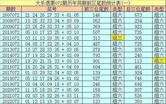 在大乐透第072期历年同期奖号中,前区后三位尾数出号频次分别为:尾数3出现8个,尾数2、5出现6个,尾数4、6、7出现5个,尾数0出现4个,尾数1、8、9出现3个。其中尾数数字三类型豹子、组三、组六次数比为0:1:15,今年同期后三位尾数类型参考组六;