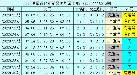 上期回顾:体彩大乐透第2023040期奖号为:04 05 18 22 30 + 05 12,其中前区号码012路比为2:2:1,奇偶比为1:4,包含1个重复号码:30。后区号码和值为17,跨度为7。