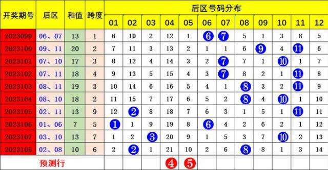 上期开出后区号码:02 08,热热组合。冷热分析:近十期,冷冷组合1次,热冷组合0次,冷热组合4次,热热组合5次,总体热冷组合出码较冷,根据图标分析,本期预测冷冷组合后区回补,关注号码:01 03 04 05 12。精准推荐:04 05。
