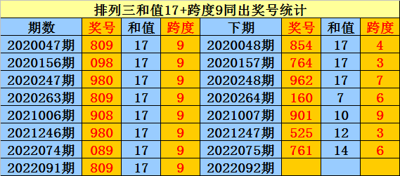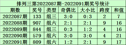上期回顾:排列三第2022091期开奖号码为809。奖号类型为组六,奇偶比为1:2,大小比为2:1,跨度为9,和值为17。