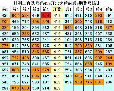 四、排列三直选号码419历史上开出13次,其前后五期奖号分别为: