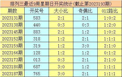 三、体彩排列三前9周星期日奖号分别开出:583-440-883-318-319-128-013-687-765,其中号码012路比为10:8:9,奇偶比为14:13,大小比为13:14;