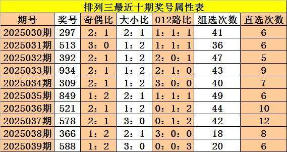 上期回顾:体彩排列三第2025039期奖号:588,奇偶比1:2,大小比3:0,012比0:0:3。