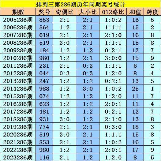 本期为排列三第2024286期开奖,历史上排列三第286期已开出了19期奖号了: