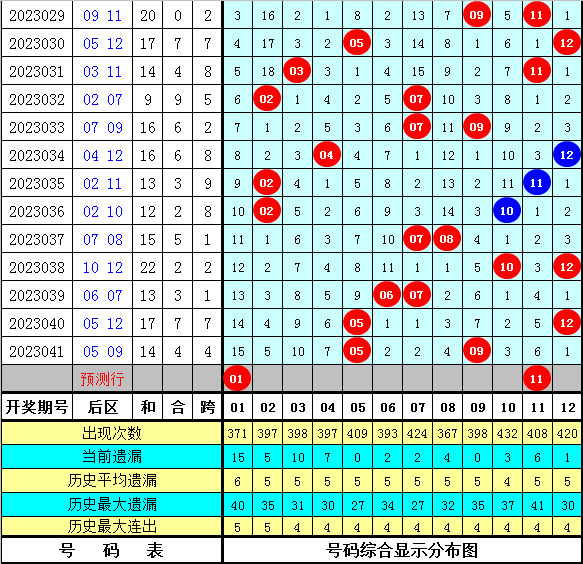 后区奖号分析:上期后区开出奖号05+09,最近100期后区冷温热码个数比为38:59:103,前50期后区冷温热码个数比为19:26:55,最近10期后区冷温热码个数比为5:3:12,目前后区含有冷温热码个数比为2:4:6,本期后区号码大范围参考:01、04、07、11、12,单挑两码01、11。