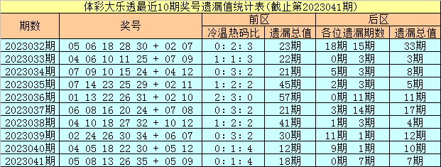 彤彤第2023042期体彩大乐透前区遗漏分析:(定义:前区遗漏0-4期号码为热码,遗漏5-12期号码为温码,遗漏13期及13期以上为冷码)
