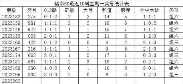 福彩3D最近10周星期一开出奖号分别为: