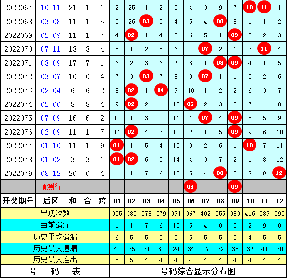 后区跨度分析:在历史同期开奖中,后区跨度奇偶比为10:5,其中奇数跨度走势明显,本期看好跨度再出奇数,参考3。