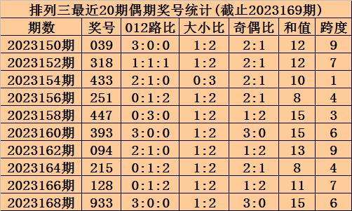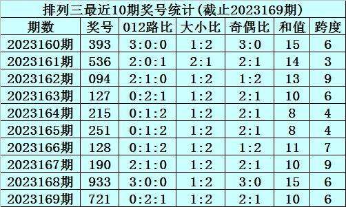上期回顾:排列三2023169期奖号为721,奇偶比为2:1,大小比为1:2,跨度为10。