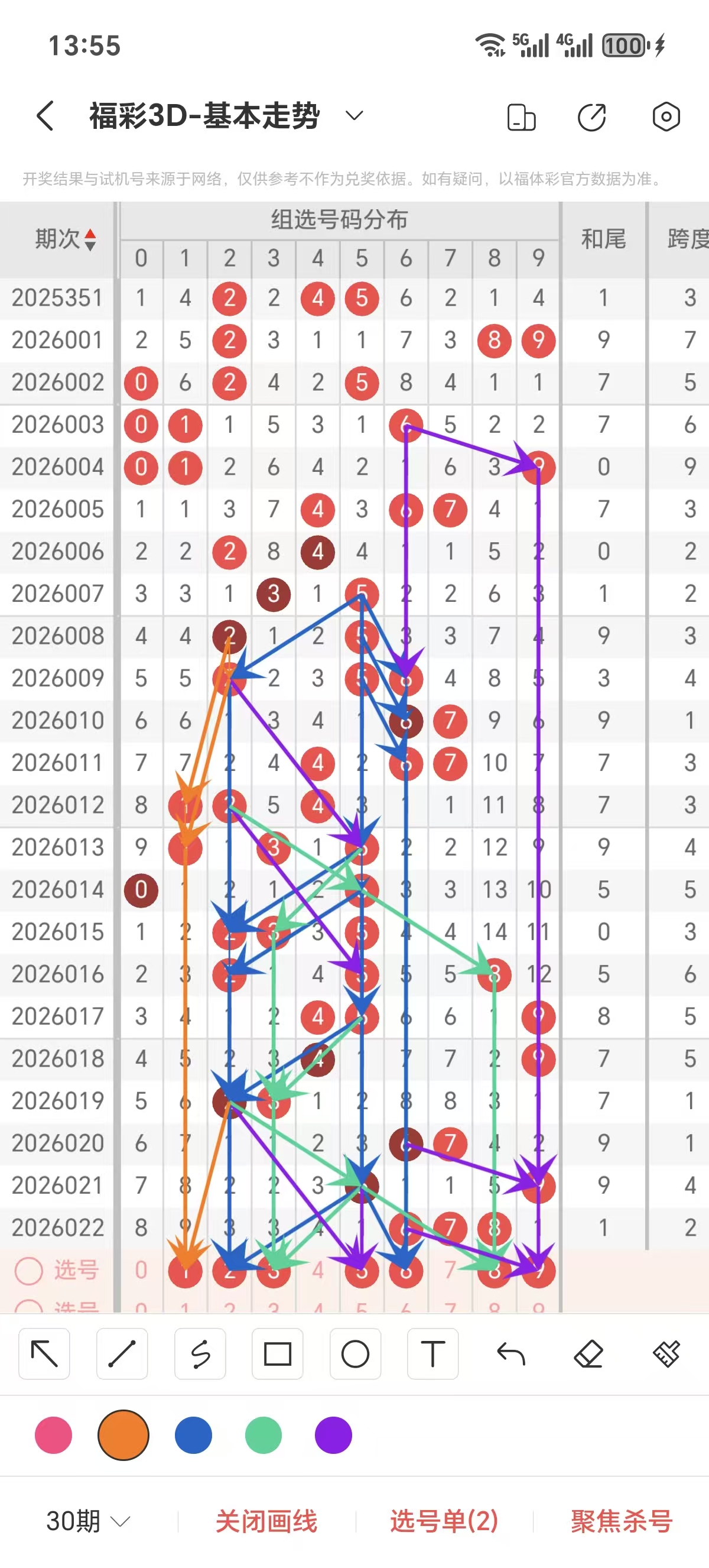 跨度通常情况下在五期之内重复一个跨度的概率很高,近五期重复了1的跨度,近五期跨度为5/1/1/4/2,近期12路的跨度较热,上期是2路的跨度,本期要侧重跨度以4/6/9跨为主的号码组合。可以从跨度方面选择相应的双胆码组合,双胆码的选取要根据近期和历史的走势进一步的分析选取。