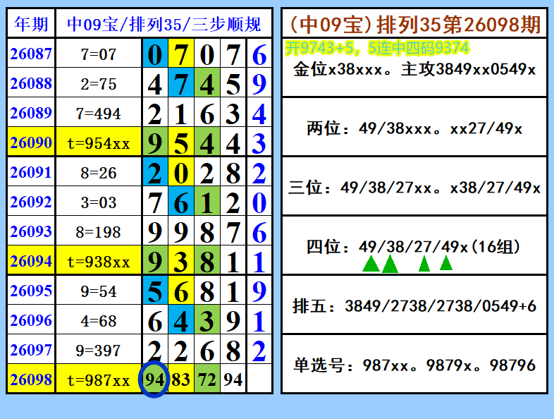 排列35第26099期(综合图文),单选推荐,视频上期中四码9374