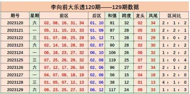 大乐透第2023129期开奖号码:前区09 23 25 27 33,后区06 12;龙头09,凤尾33,和值117,跨度24,前区号码区间比1:1:3,012路比3:1:1,奇偶比为5:0,大小比为4:1,冷热比2:3,0枚重号,0组连号。