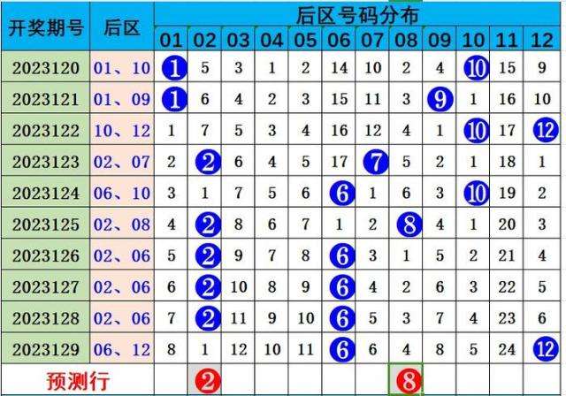 上期后区号码为06号和12号,为小大、偶偶组合,近5期奇偶比0:10,偶号出号较热,预计本期小大、偶偶组合出现。本期推荐02 08 。