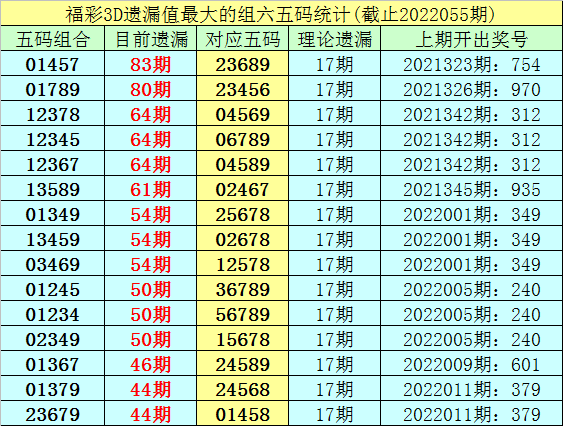 3。福彩3D第22055期10个遗漏最大的五码组六开出1个。