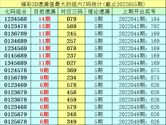 1。截止第22055期,七码组六遗漏最大的是:1234568,当前遗漏14期。