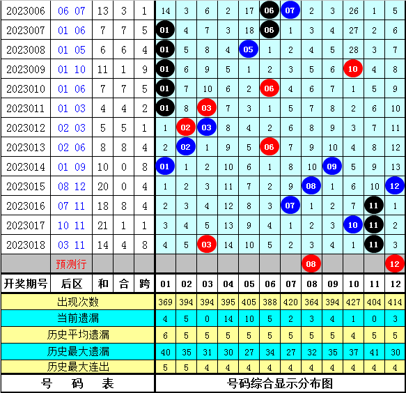在历史同期开奖中,后区号码和值奇偶为11:5,其中偶号和值开出比例较低,本期注意偶号和值逐渐回补,关注和值20。