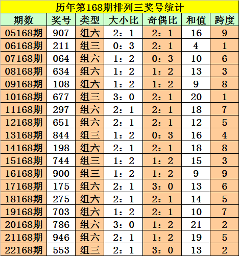 历年第169期奖号中:组三开出6次,组六开出11次。组三、组六走势相当,本期关注组三。