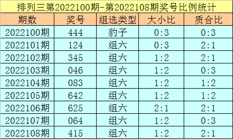 上期回顾:排列三第2022108奖号开出415,奖号质合比为2:1,大小比为1:2,跨度为4,类型为组六。