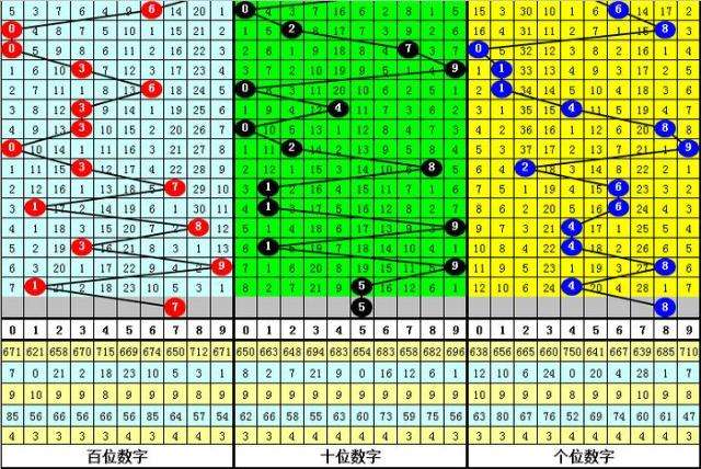 百位走势:近10期在0-9之间出号,跨度为10点,出号比较分散,上期奖号为1,下降8点,本期看好该位上升。另外近10期该位大小比为3:7,大号较冷,本期注意大号回补,关注号码7。