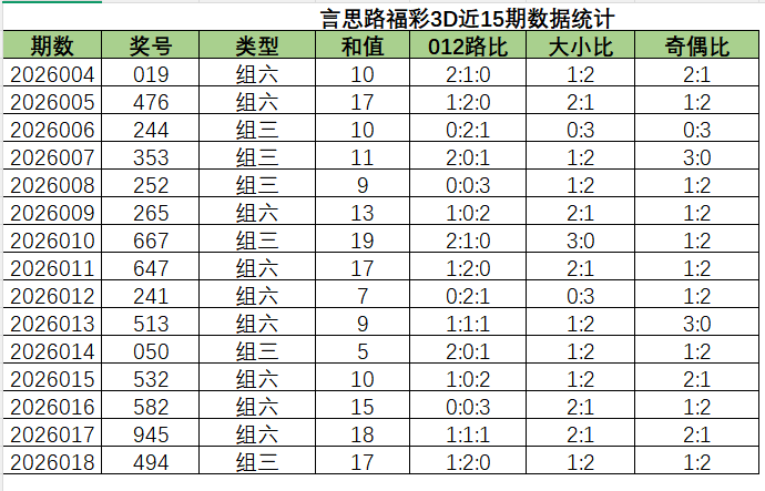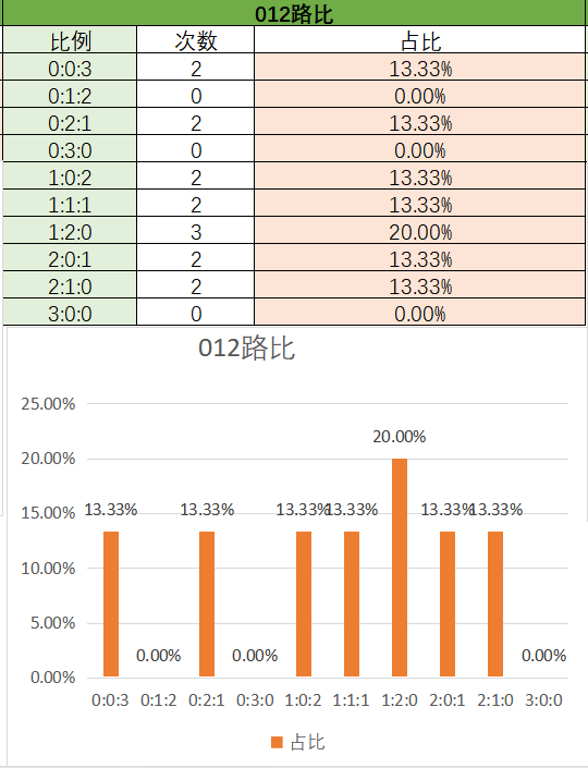 上期012路比是1:2:0,其中1:2:0占比变大,2:1:0占比变小。近15期内1:2:0是开出最多的,然后是1:0:2,2:0:1,0:2:1,0:0:3,2:1:0,1:1:1。总的看2路最热门,其次是1路,最后是0路,本期看好1:1:1和2:1:0。