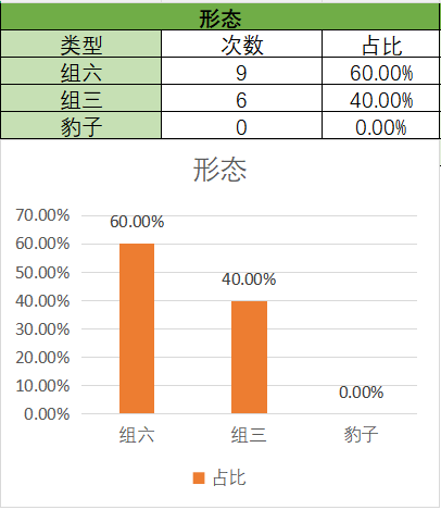 上期开的是组三,其中组六占比变小,组三占比变大。通过图示可以看到,组六在15期内开了9期,组三开了6期。本期关注组六,防组三。