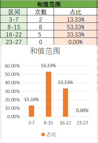 上期和值是17,处在16~22之间,其中16~22占比变大,3~7占比变小。目前是8~15占比最优,其次是16~22,最后是3~7。本期看好和值在8~15之间,其次是16~22。