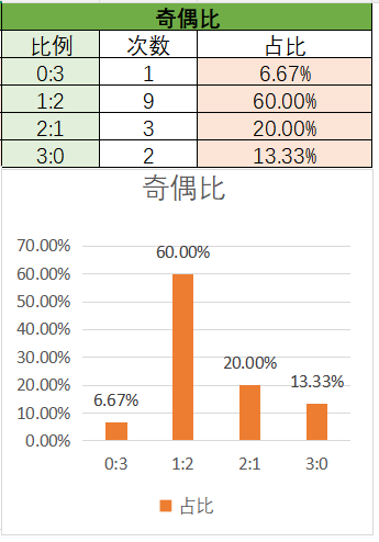 上期奇偶比为1:2,各个类型占比没有变化。近15期内1:2优势最大,其次是3:0和2:1,最后是0:3。上期开了1:2奇偶比,本期看好2:1奇偶比的开出,其次是1:2。