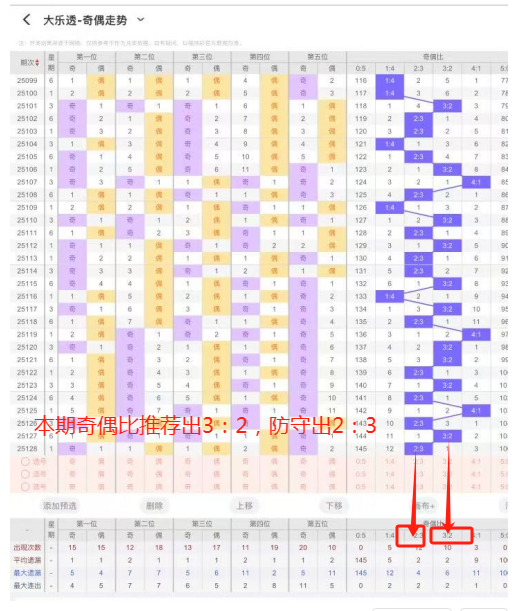 4、奇偶比:上期开出2个奇数 03 33,出3个偶数06 26 30,奇偶比为2:3,整体看奇数强势,本期重点看奇数出号,本期推荐出3:2,防守出2:3。