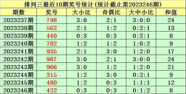 上期回顾:排列三第2023246期奖号为:422。奖号类型:组三,和值:8,奇偶比:0:3,跨度:2,大小比:0:3。